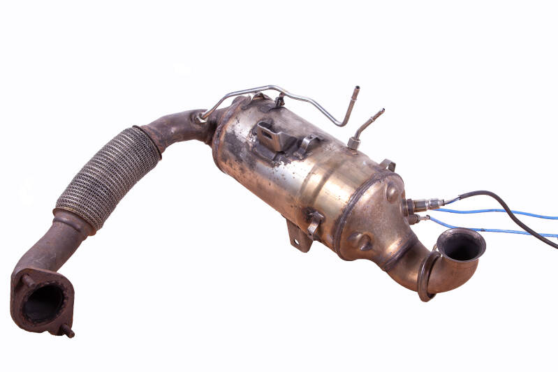 Gesloten roetfilter van een personenwagen. Aan de rechterkant is de intrede en aan de linkerkant de uittrede.